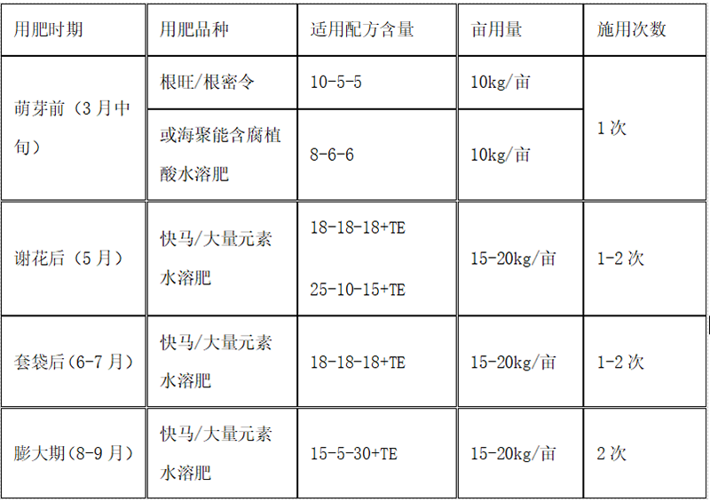 科學研究表明,每生產(chǎn)1000公斤蘋果,約需要吸收(折純)氮4-6公斤,磷2-3公斤,鉀6-8公斤,鈣3-4kg、鎂1.5-2kg,硫0.4-0.5kg,同時還應滿足硼鋅鐵等微量元素的供應。