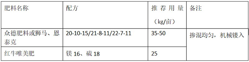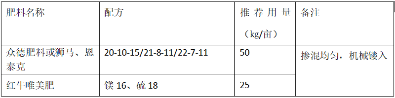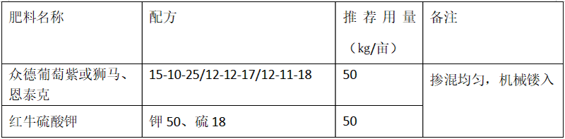 ?。?)推薦施肥套餐(根據(jù)目標(biāo)產(chǎn)量、地域、品種、樹勢(shì)、樹齡、地力等適當(dāng)調(diào)整)