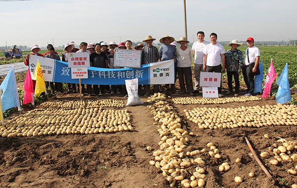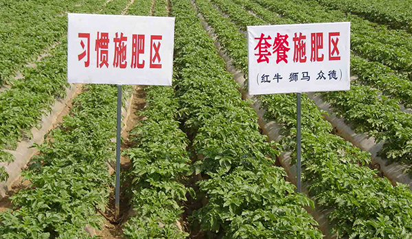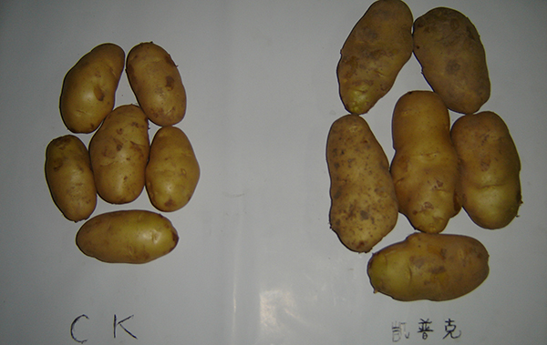 河南鄭州市滎陽(yáng)高村農(nóng)民黃海望,共種6畝馬鈴薯,其中5畝用的眾德套餐,眾德生物有機(jī)肥80公斤,15-10-20高鉀型眾德牌摻混肥100斤在翻地前施用,100斤15-10-20高鉀型眾德牌摻混肥種肥同播,出苗后用態(tài)康科250倍液噴施兩次,另外一畝做對(duì)照,同等有機(jī)肥,100公斤15-15-15含量的復(fù)合肥作底肥。施用眾德牌摻混肥的馬鈴薯莖葉不旺長(zhǎng),發(fā)根早、根粗、苗壯,中期苗高比對(duì)照高15-20厘米,長(zhǎng)勢(shì)好、病害少,收獲時(shí)馬鈴薯個(gè)頭大、品質(zhì)好、表面光滑,上市早,賣價(jià)高,產(chǎn)量比對(duì)照高58-60%,畝產(chǎn)達(dá)到6100多斤。